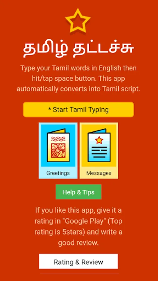 Tamil Typing (Type in Tamil) app is an English to Tamil transliteration tool. Type your Tamil words in English and hit/tap space button. This app automatically converts into Tamil script.