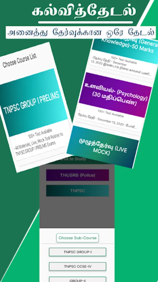 This App covers all exams Syllabus (பாடத்திட்டங்கள்), exam pattern, School books (பள்ளிப் பாடப்புத்தகங்கள்) important topics from school books both old and new books from standard 1 to standard 12 covering English and Tamil Subjects, Previous year question papers (முந்தைய வருட வினாத்தாள்கள்) in PDFs as well as Videos.
