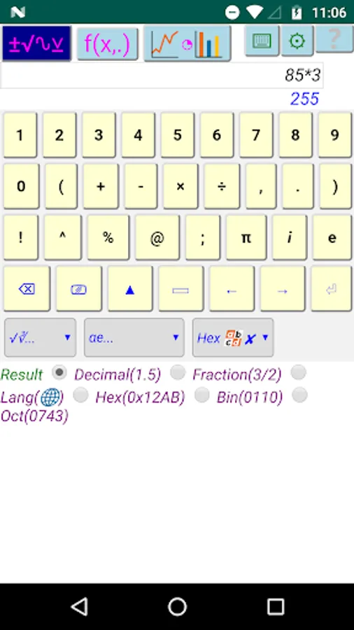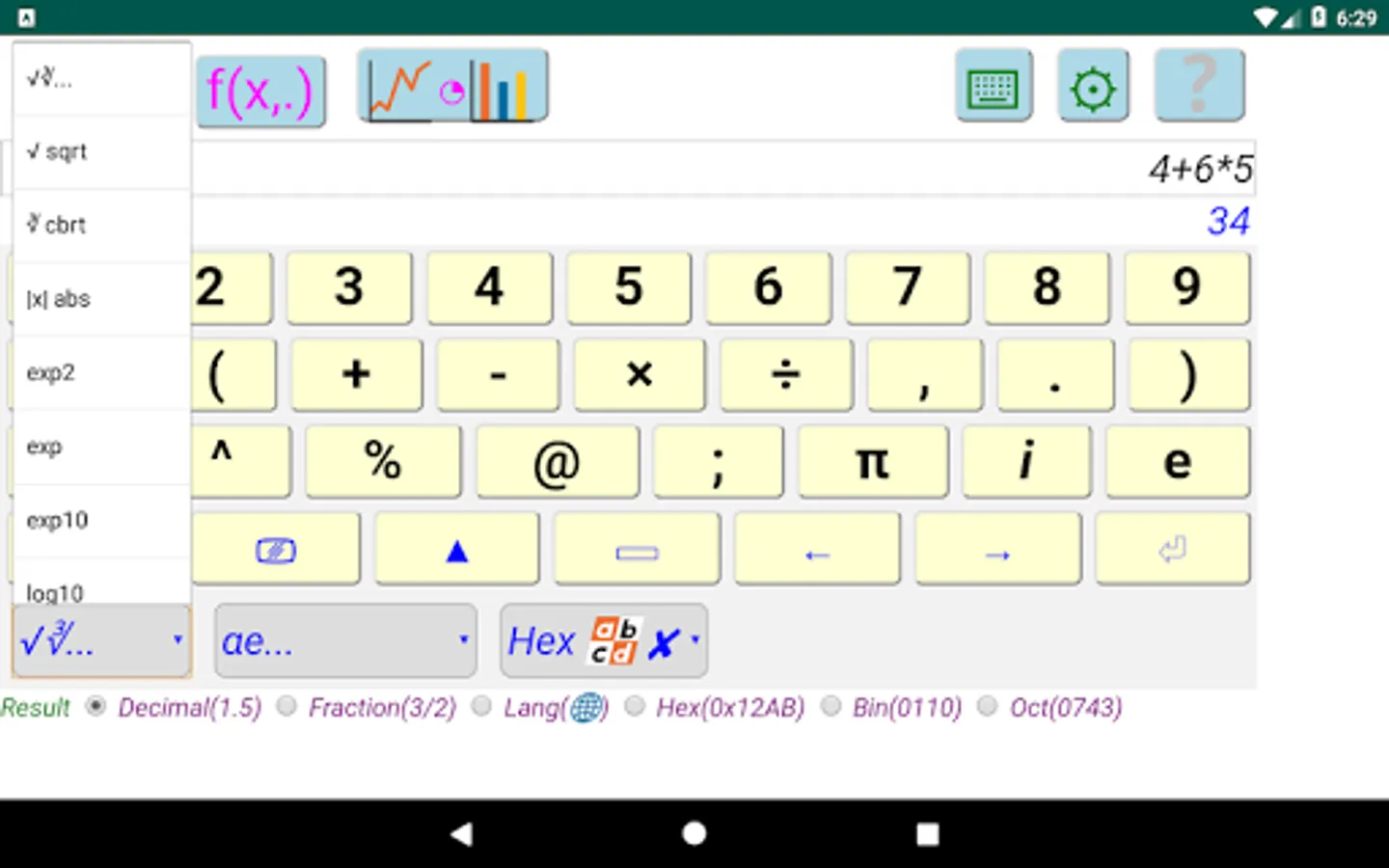 App Keyboard lists supported functions, constants, variable name, operators, hexadecimal letters for easy access.