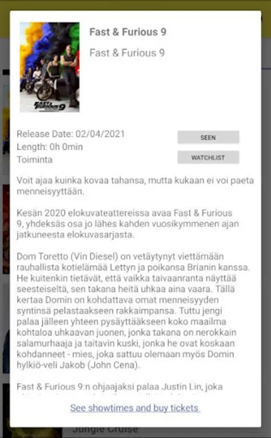 With MovieT, you can view movies coming soon or currently playing in Finnkino theatres. You can also save movies to your personal watchlist or seen list and rate them for your own pleasure.