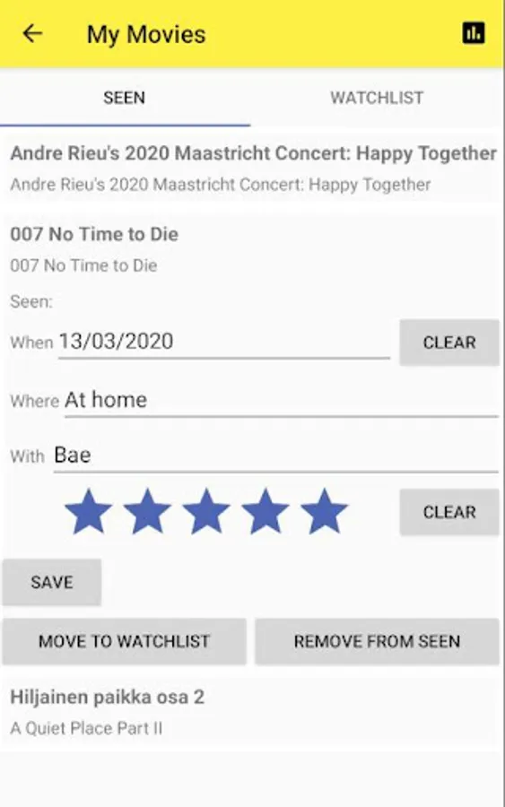 Add information about when, where and with whom you saw the movie, rate the movie and get statistics of your viewing experience. Fun for the whole family!