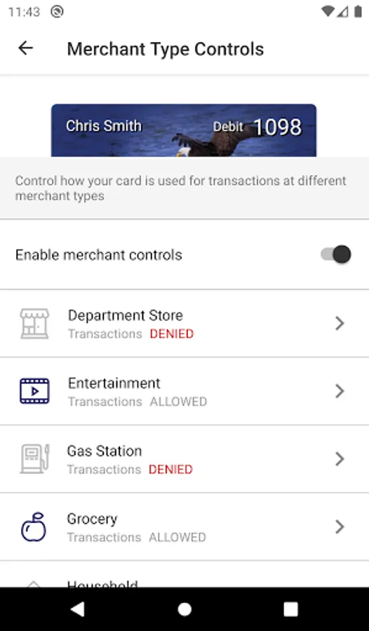 Spending limits can be established to allow transactions up to a certain dollar value and decline transactions when amounts exceed your defined thresholds. Transactions can be monitored and managed for specific merchant categories such as gas stations, department stores, restaurants entertainment, travel, and groceries. And your transactions can also be monitored for specific transaction types: in-store purchases, e-commerce transactions, mail/phone orders and ATM transactions.