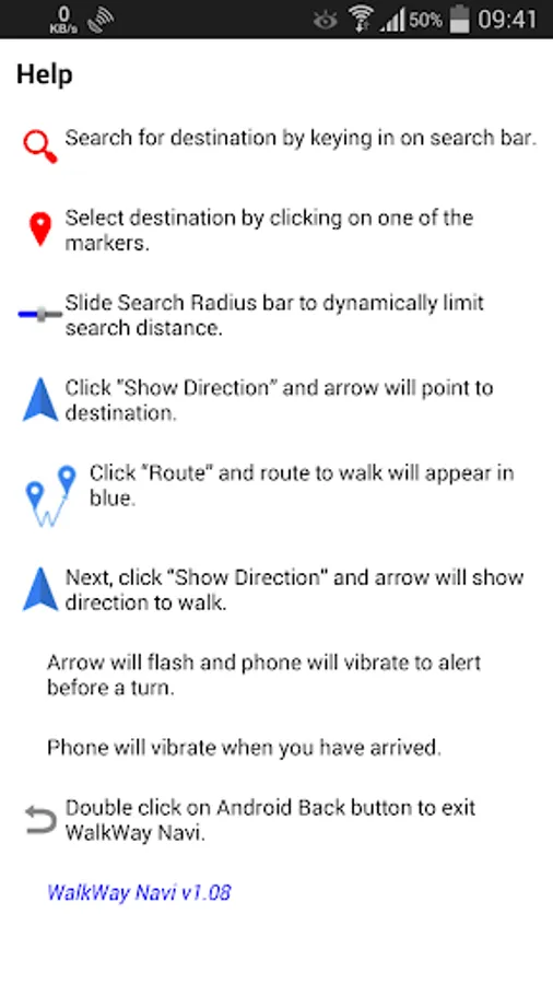 Frequently, maps are more likely to confuse you and you end up going the wrong way. With the WalkWay Navi app all you need is to follow the arrow and feel the vibration on your smart phone. It's a personal GPS navigator for walking without having to worry about reading maps and getting your bearings.