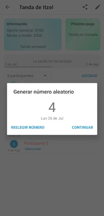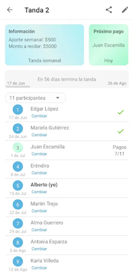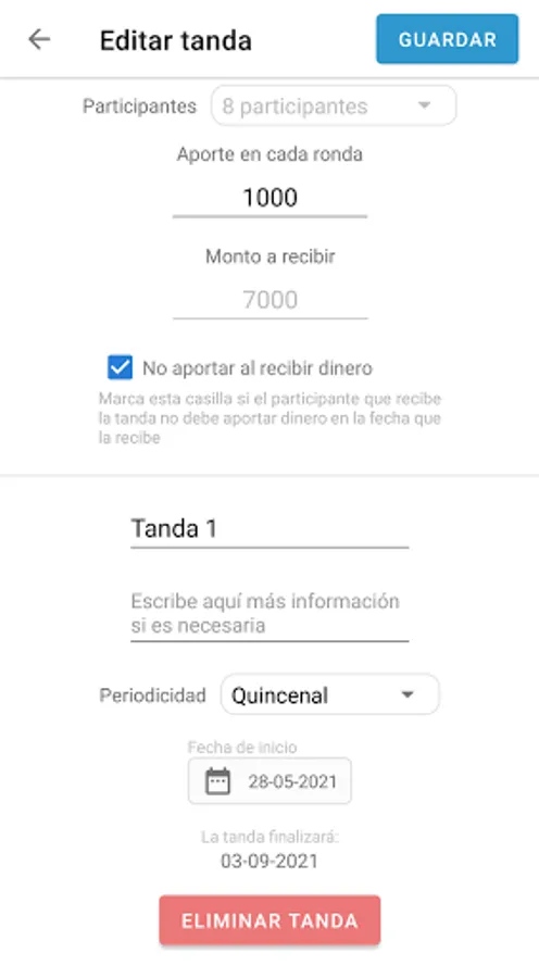 - Choose the periodicity and the number of participants to automatically calculate the payment dates and the amounts of the batch