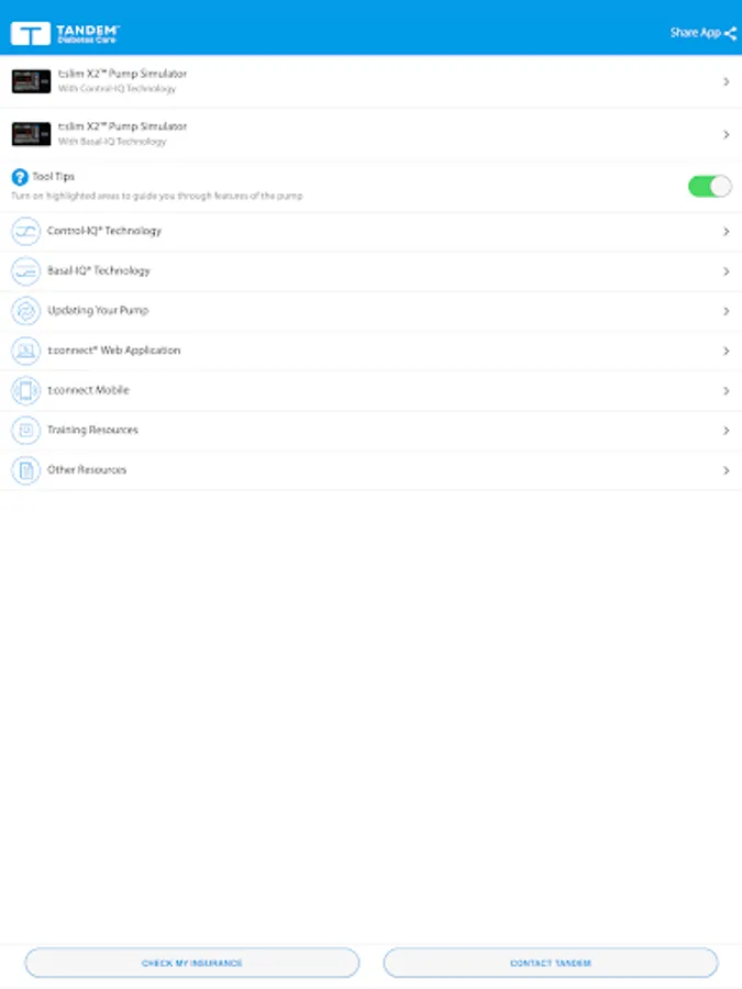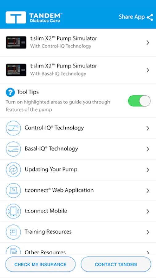 The t:simulator™ App is an easy way to explore the simple touchscreen interface of the t:slim X2™ Insulin Pump from Tandem Diabetes Care, no prescription or insurance verification required! Whether you’re a person living with diabetes, a relative or caregiver, or a healthcare provider, we make it simple to explore the t:slim X2 Pump’s features on your mobile device.