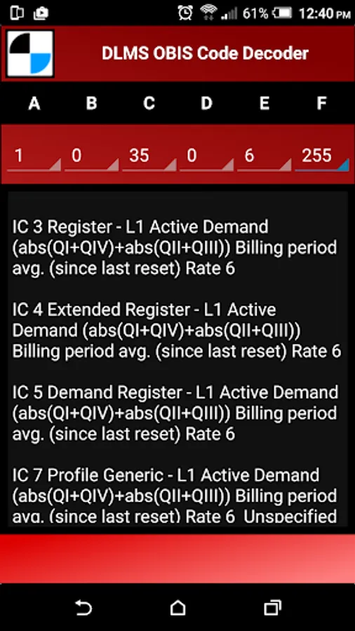 Easily select valid codes and the app will identify the IC (Instance Class) and the Description of the OBIS Code
