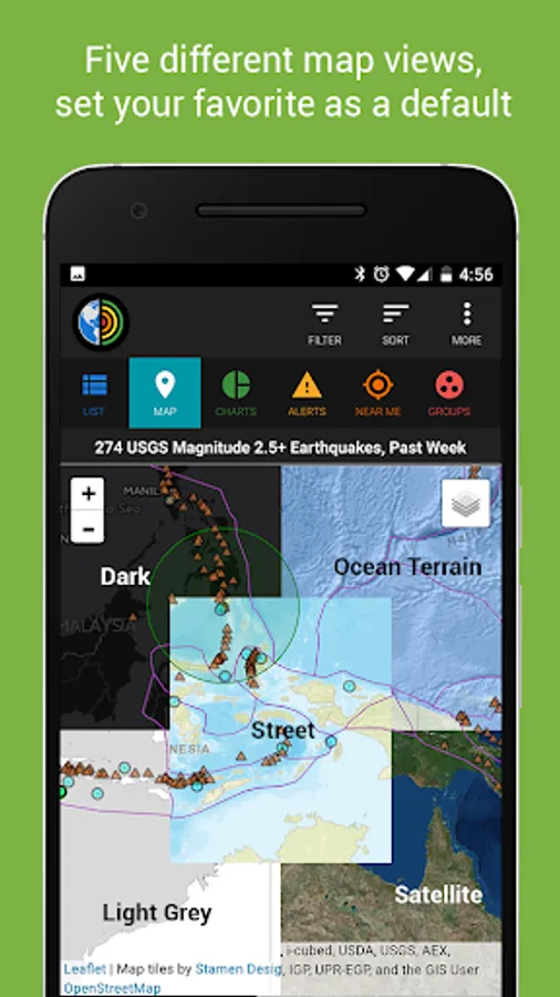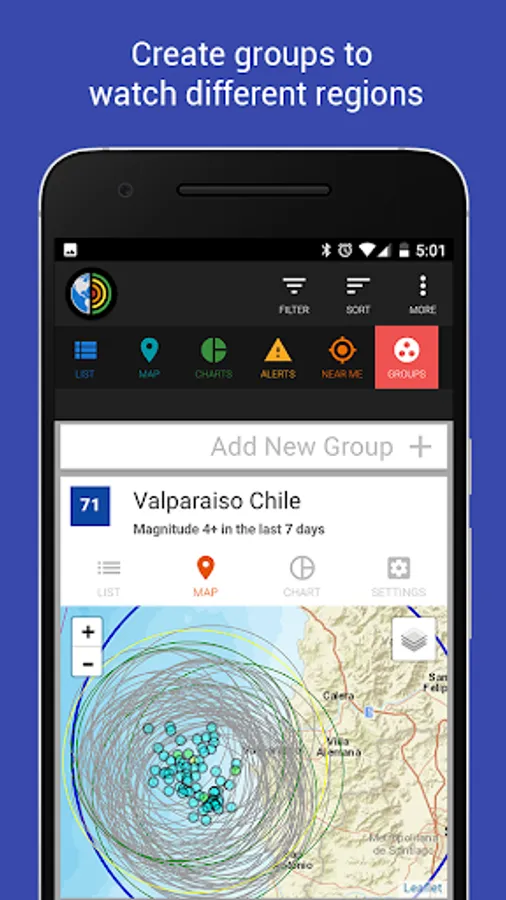 - Custom set groups by radius, magnitude, and time frame that are saved in the app.