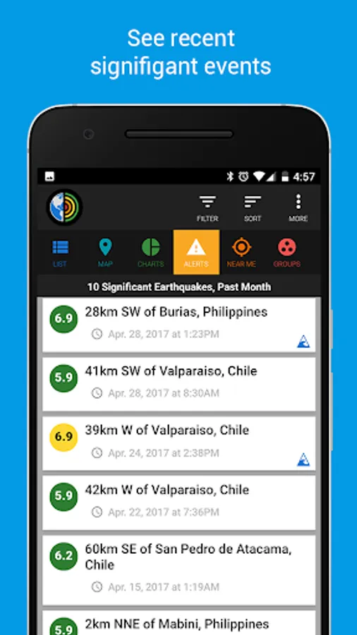 - Alerts display recent significant earthquakes, and will show you when new ones have occurred since the last time you used the app..