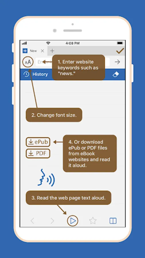 Conveniently download ePub, PDF, txt files from websites and read them aloud.