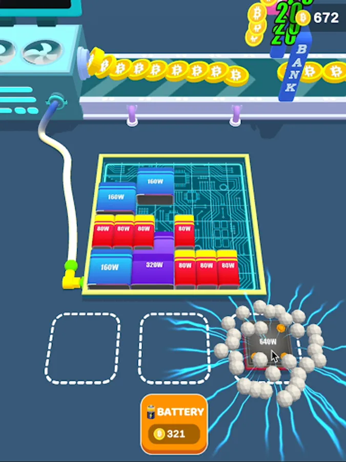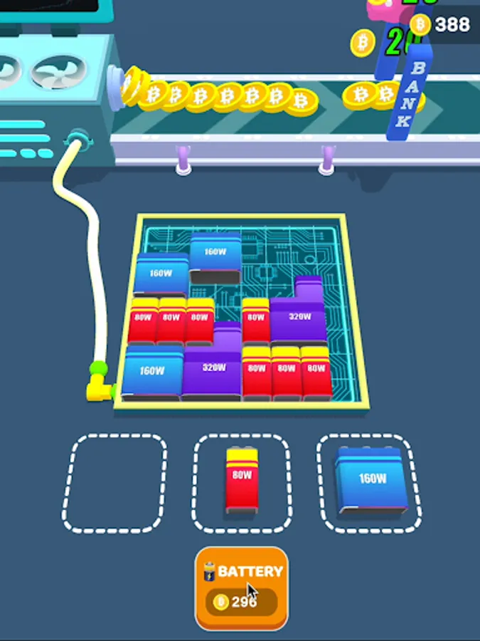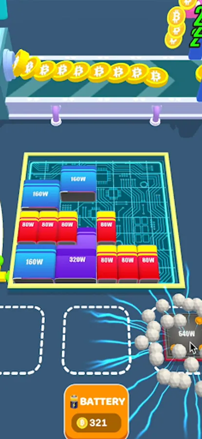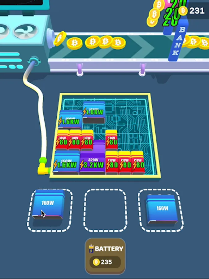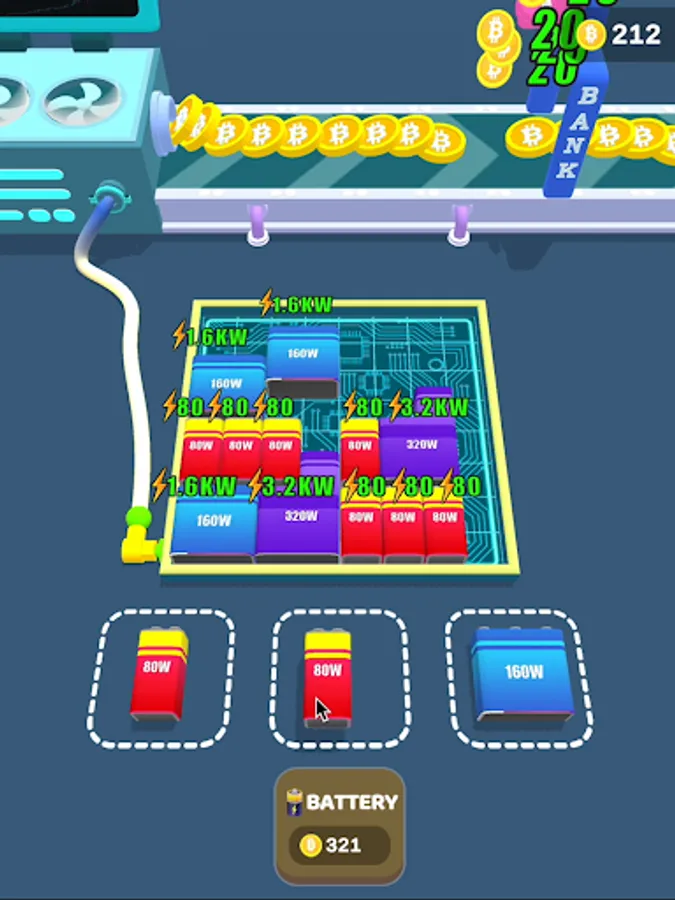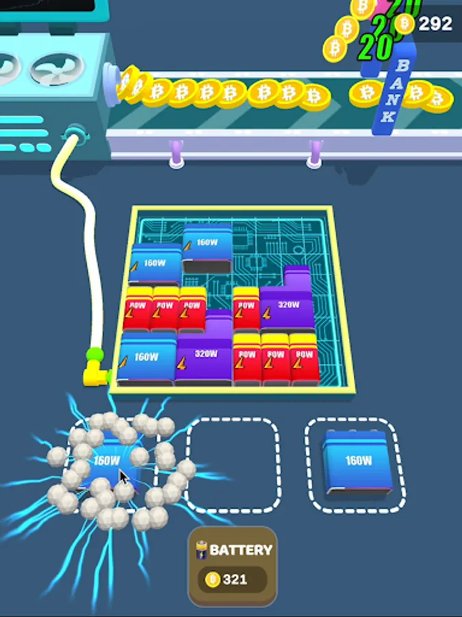 Merge the batteries, produce more power and generate bitcoins. Earn more to purchase more batteries and repeat.