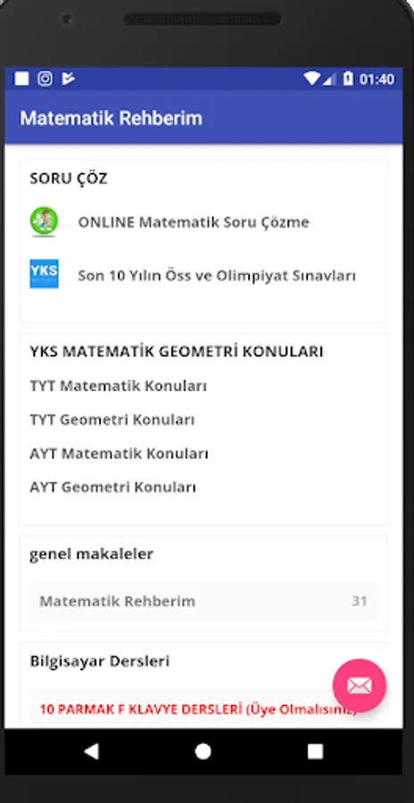 Prepared with the contributions of the Department of Management Information Systems and students of Kafkas University, Mathematics Rehberim is an application where you can find everything you are looking for in the name of mathematics. We guarantee that you will no longer have difficulty in mathematics with our lecture videos and slides. Briefly, we bring the classroom to your home. In addition, you will not believe what you have created by using a combination of mathematics and programming. We will write mathematical programs using languages such as Pascal, C, C #. Mathrehberim.com, which we have developed for those who like and love mathematics, brings you all the possibilities in the field of mathematics and programming.