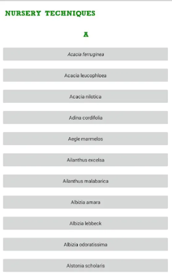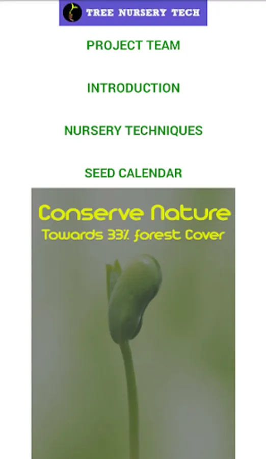 The Green India mission involves dynamic greening projects inorder to acheive the target of 33% of forest cover for which quality planting material is the key requirement! Keeping the above perspective in view this application has been designed to serve as a guide for precise nursery practitioners. It possess basic information on the selected tree species along with their specific nursery practices such as propagation techniques. This application serves the purpose of a complete ready reckoner which is very simple and user friendly.