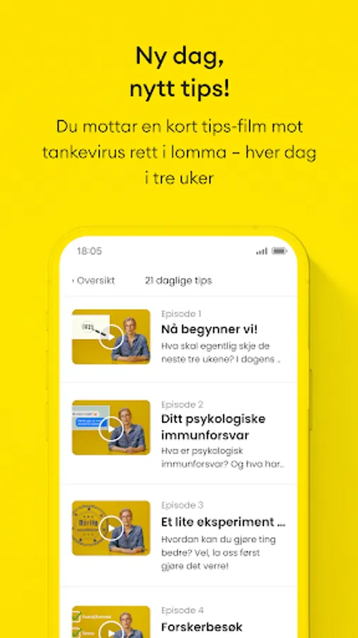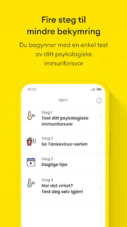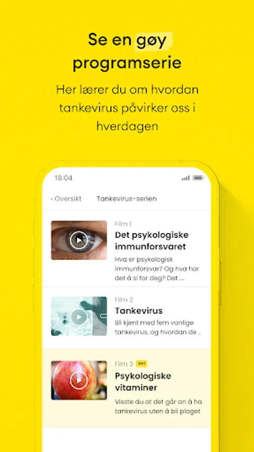 You start by watching a short and entertaining series of programs about The Psychological Immune System, Thought Viruses and Psychological Vitamins. Then starts a three-week program where you get help to detect thought viruses in your everyday life, and get to practice using psychological vitamins in the face of infected thoughts. The app also tests your psychological immune system before and after the program, so you can see with your own eyes whether the psychological vitamins have helped or not