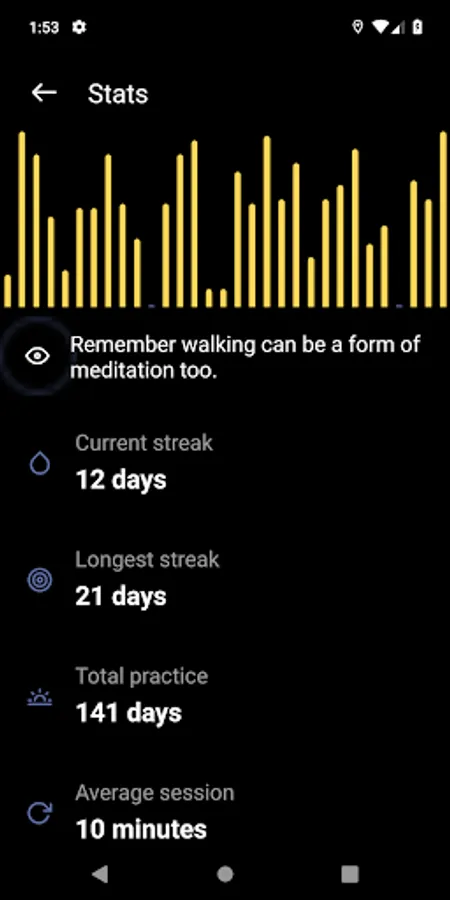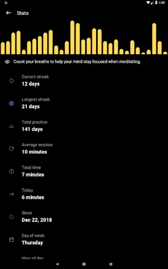 Easy-to-read visuals show your meditation practice at-a-glance and the app tracks everything from the average time of your sittings, what days and times you typically sit, how long you've been practicing, your current and longest meditation streaks, and more.
