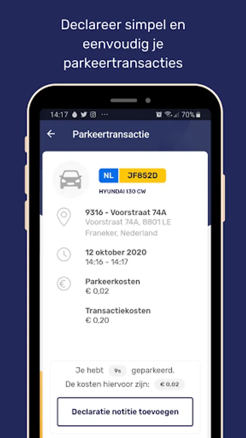 Once you have stopped the parking action, by clicking the red button, you can also declare the parking action directly . For example, when you have parked for a business appointment, you can directly send the invoice from TanQyou Park to the financial administration. It's that easy!