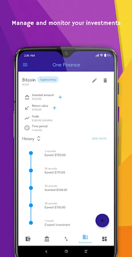 You can use Investments feature to manage and monitor all your investments in one place, with the following features: