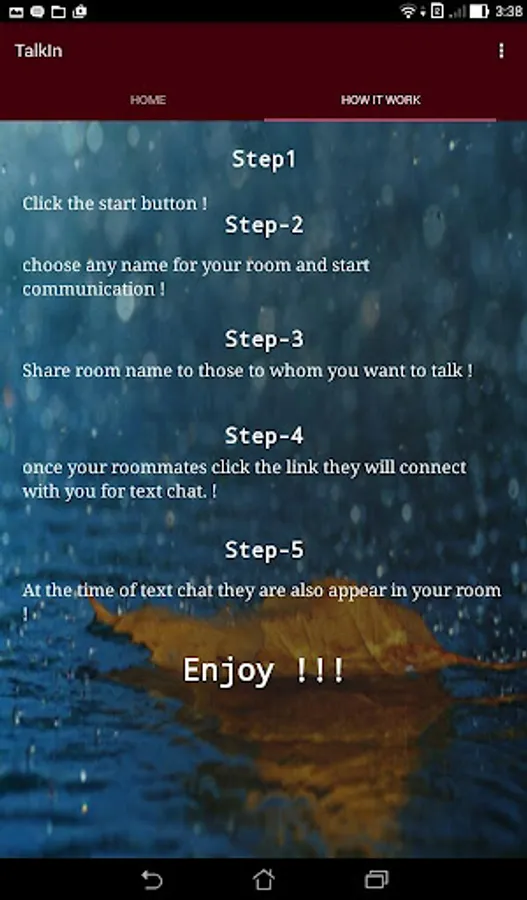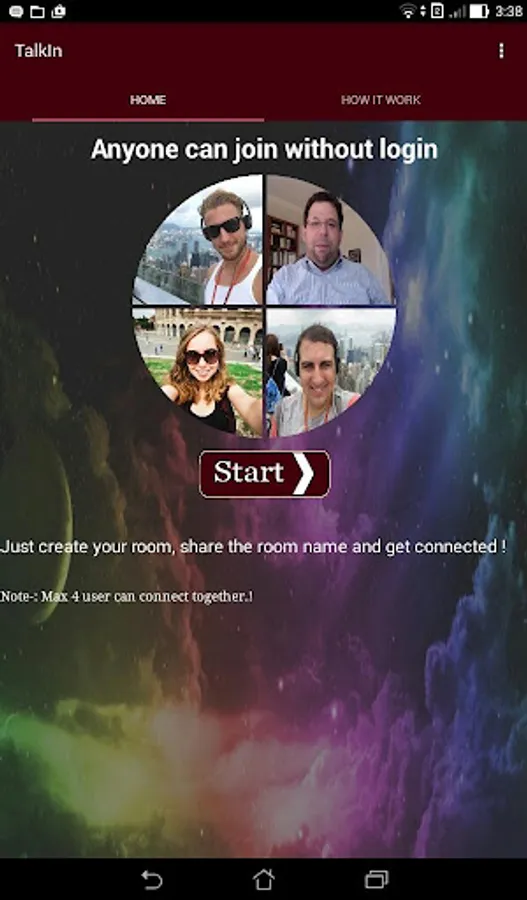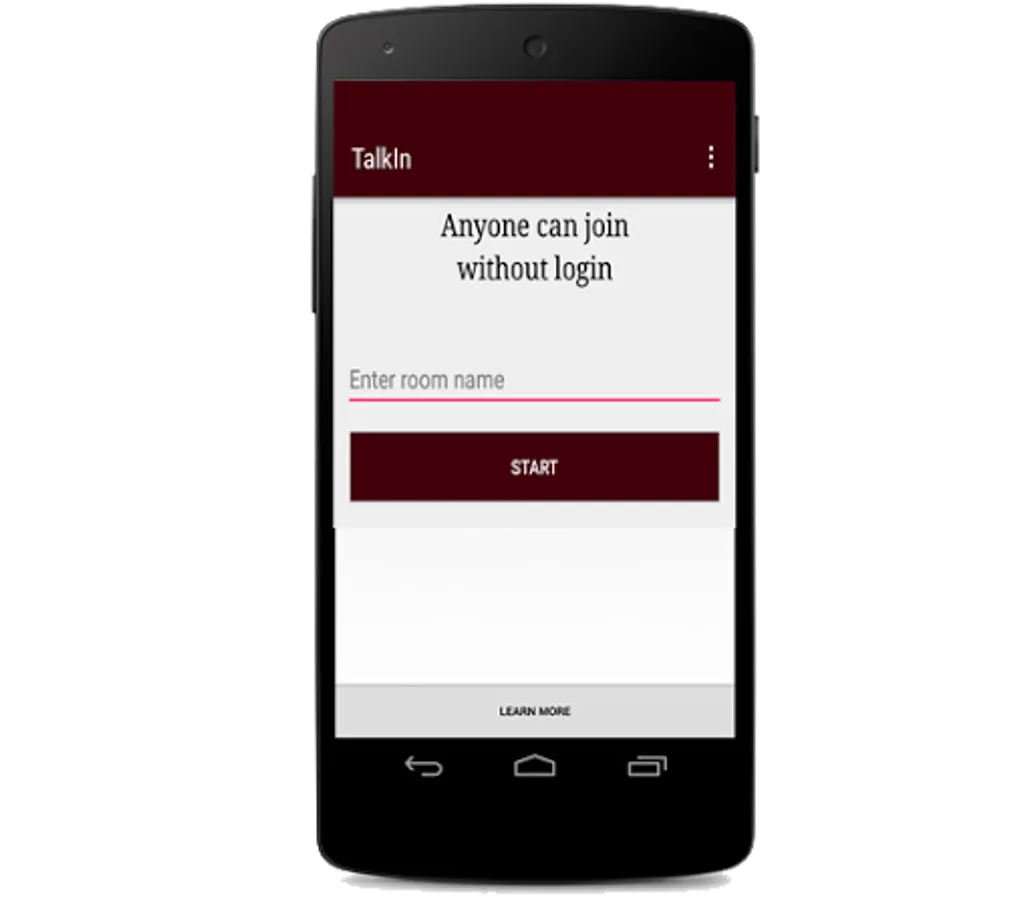 A room in our product is the place on the app where people meet to talk. To create a room, just type a room name on our app and click create. Then share the name of the room and send it to your friends.