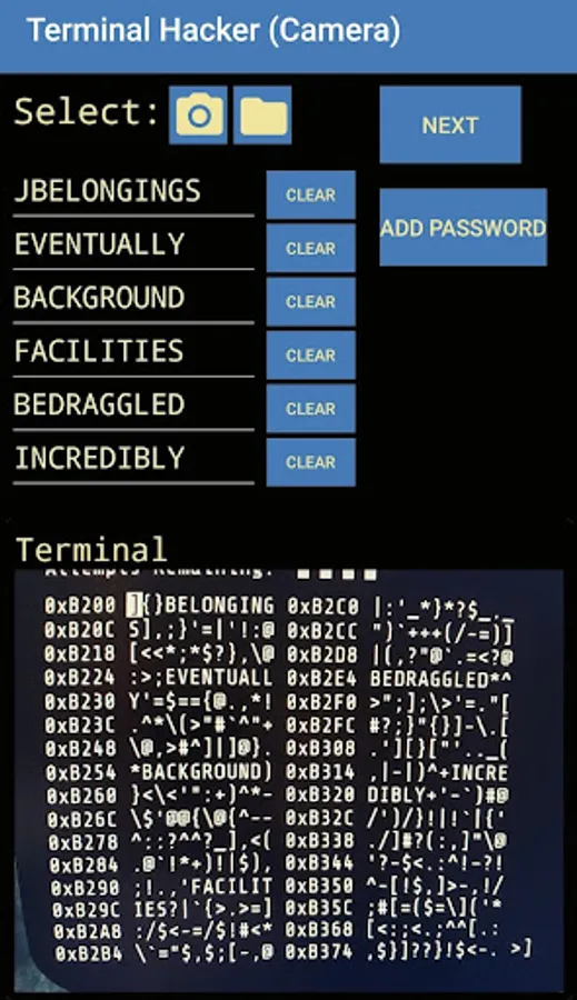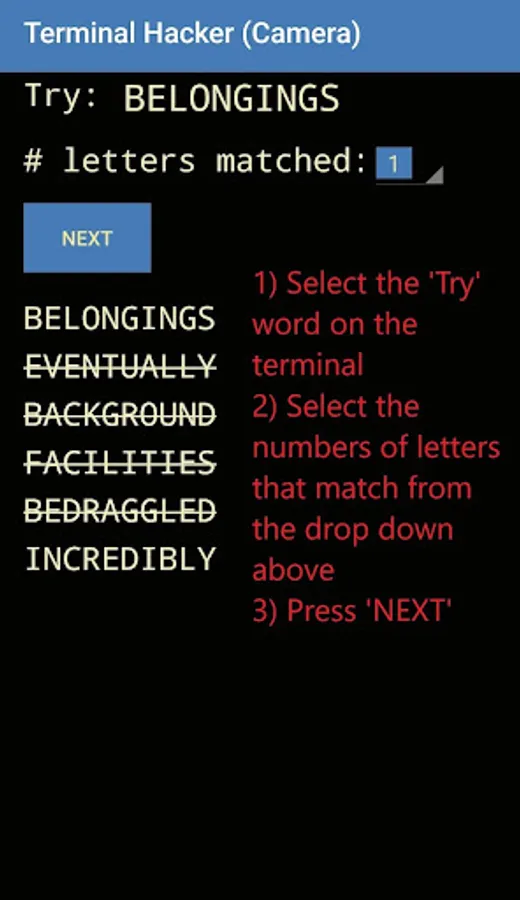 Terminal Hacker (Camera) then takes you through the list of passwords, optimizing the selection process by removing words that are not an option.