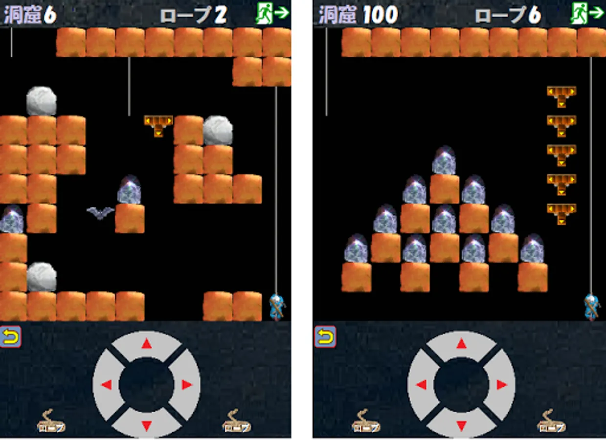 パズルゲームです。洞窟内にある水晶をすべて採るとクリア。道具はつるはしとロープだけ。岩や箱もうまく利用して。こうもりが邪魔をしますがいろいろな方法でやっつけることができます。 全100面。どの面からでも始められますが、全部クリアしないと本当のエンディングは見られません。難易度は高めです。パズルが好きな人向け。