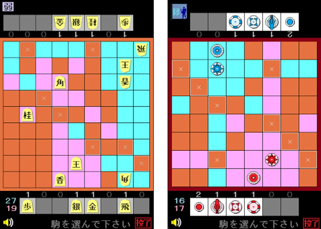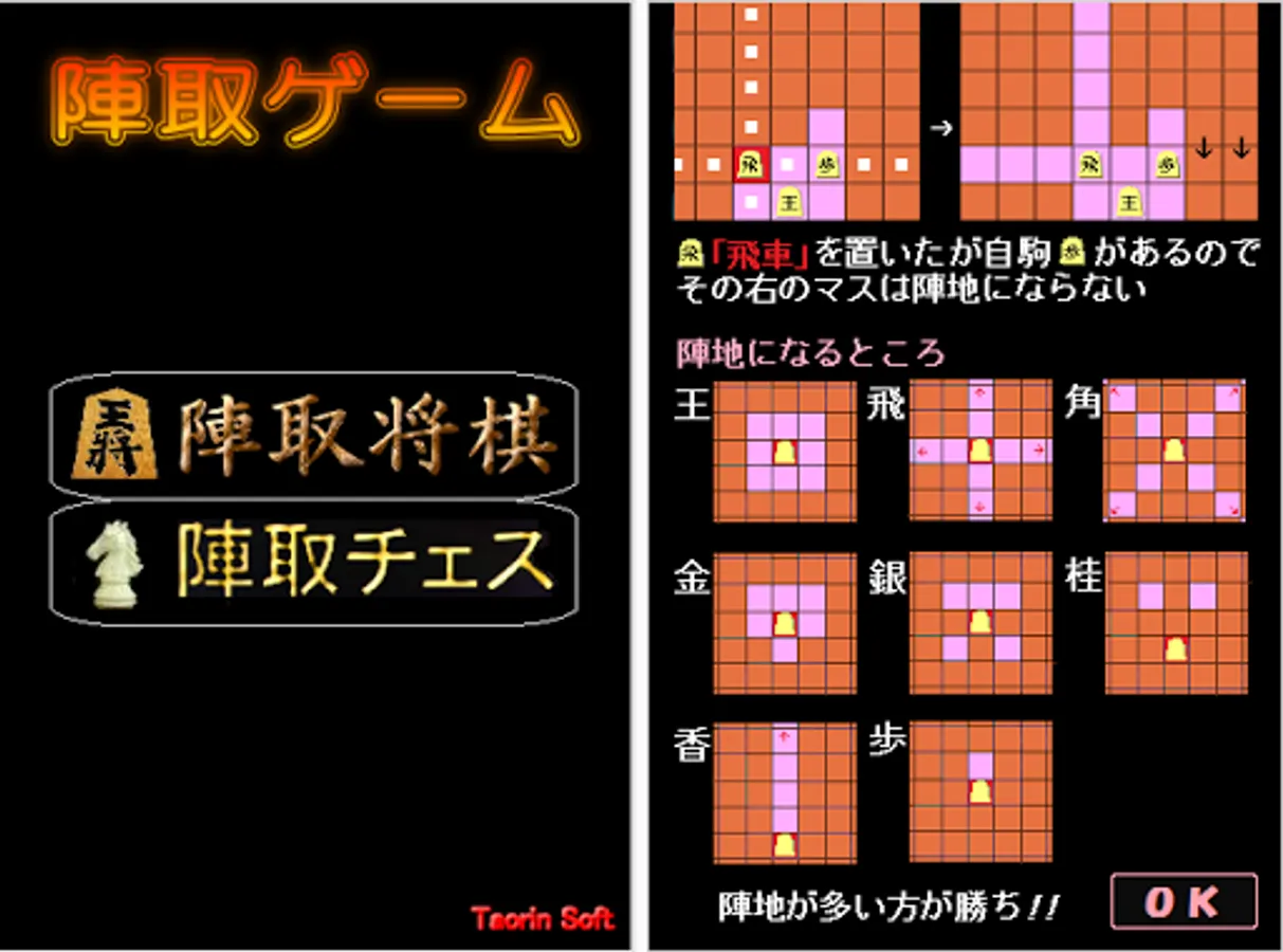 It is a board game that uses a Japanese chess and chess rules. When you place the piece, where the piece can move it will be to their position. Piece can not be placed only on their own territory. You can turn off the opponent's piece If you place well. It is wins a lot of territory. Because it is a strong piece in many of the "Chess", it is quite formidable. You can play even two people.
