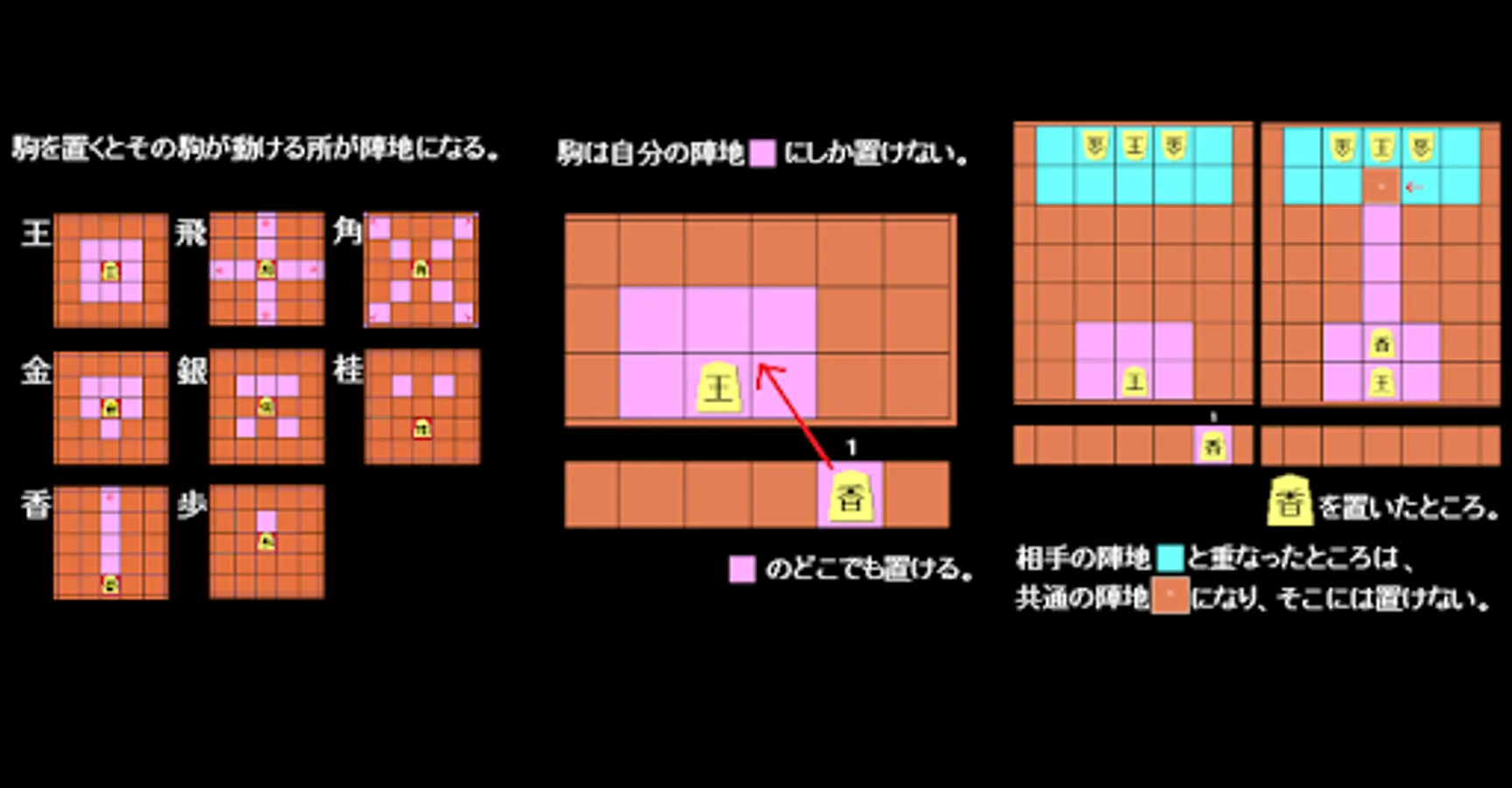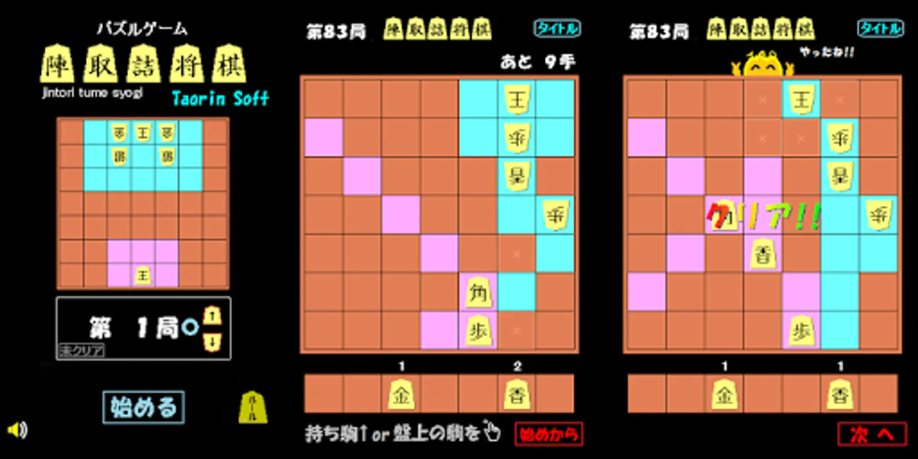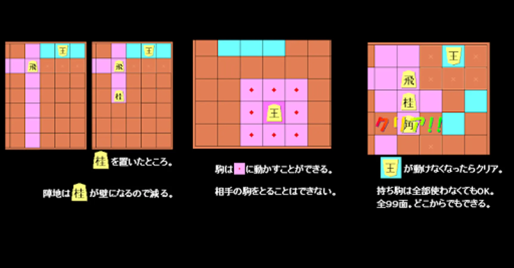 This is a puzzle game that uses Shogi rules. When you place a piece on the board, your position is where you can move it. You can place and move other pieces on that base. The opponent's (computer) king moves around, so he blocks his way well and clears him if he can't move. All 99 faces. You can start from anywhere.