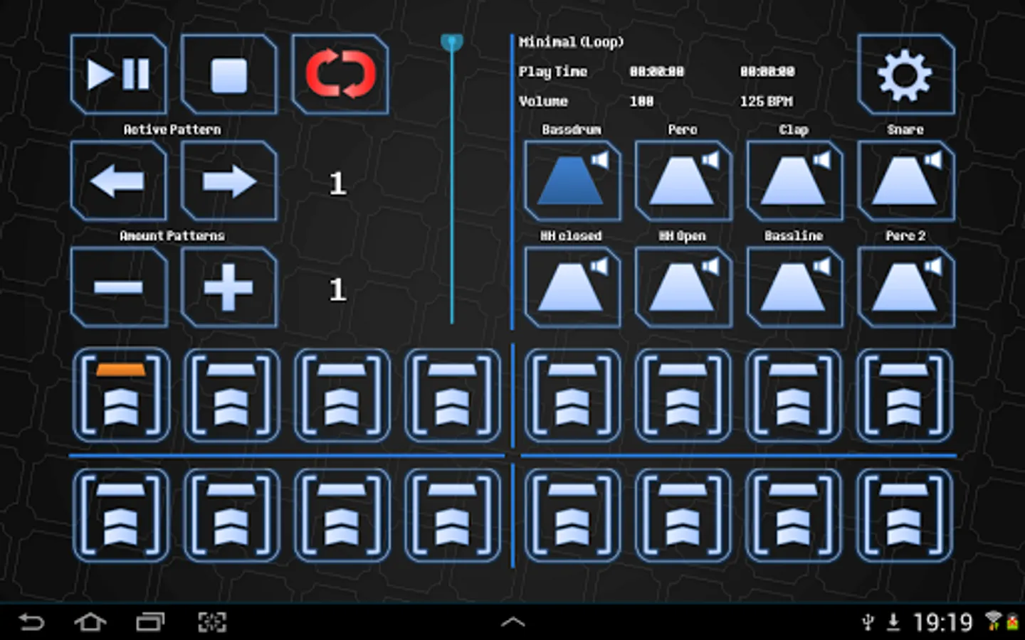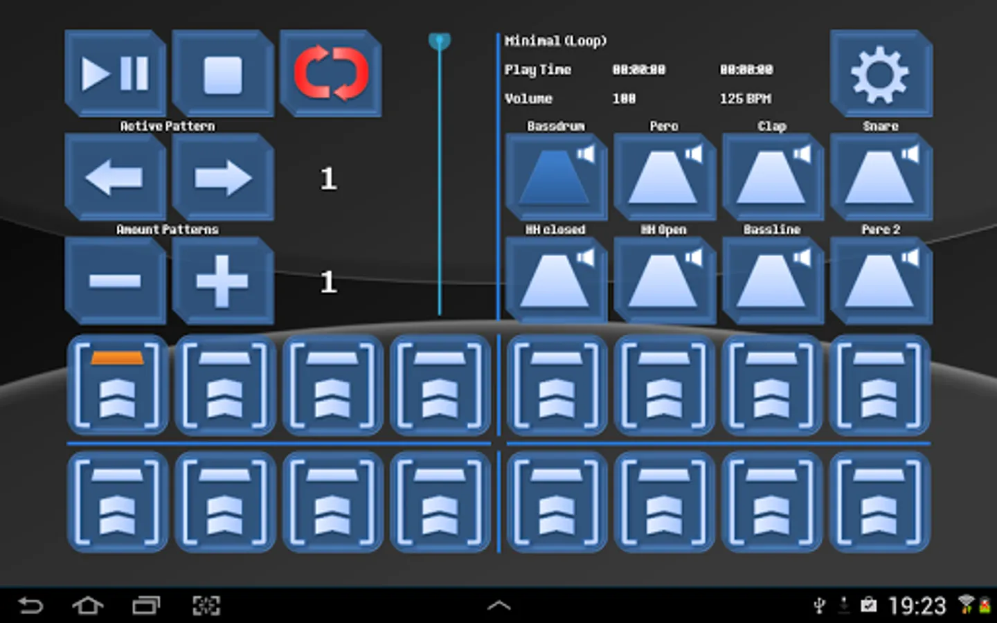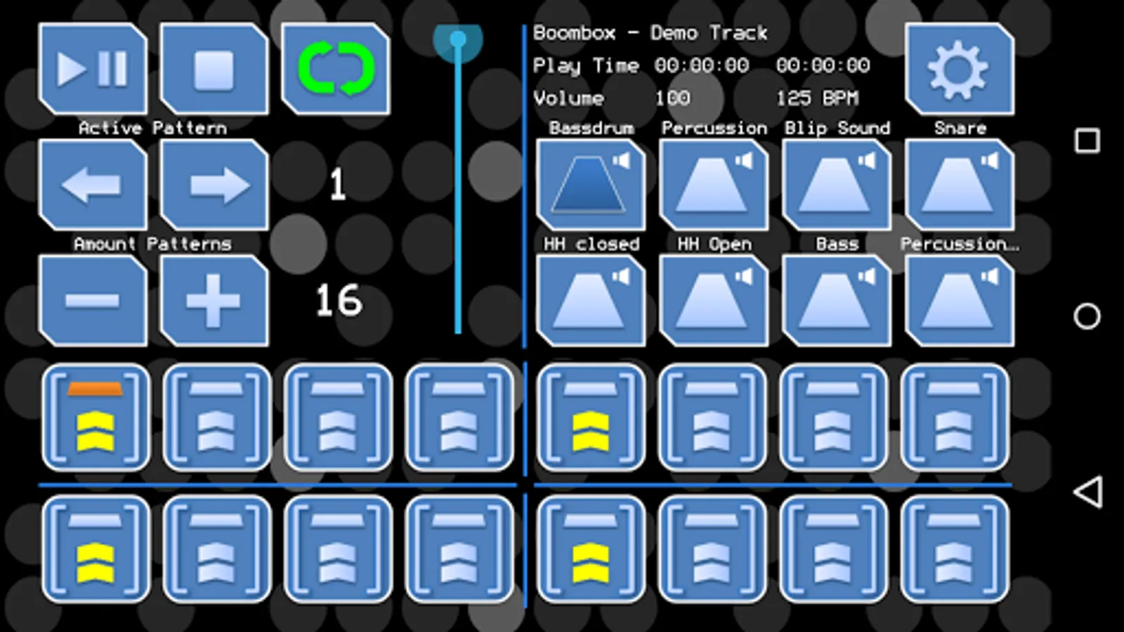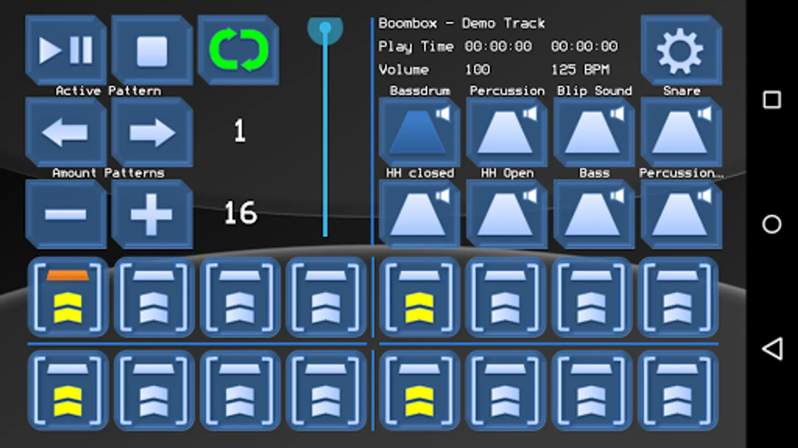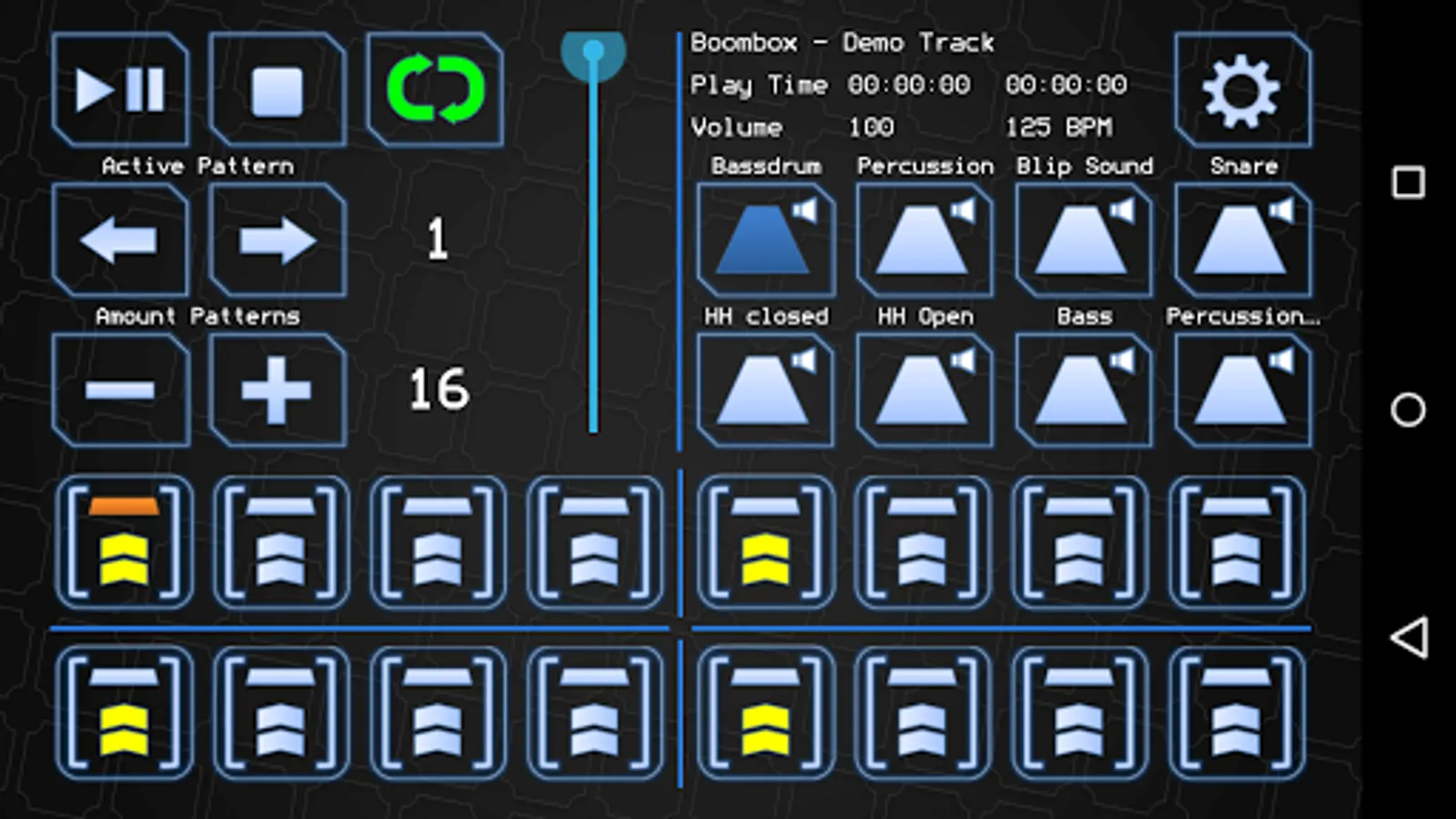 • Up to 128 patterns, each containing 16 steps
