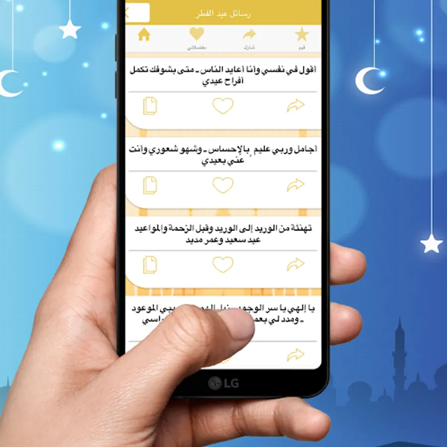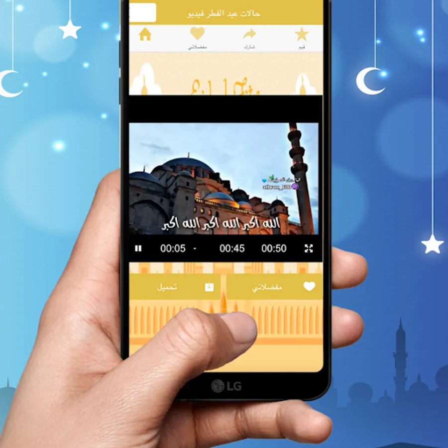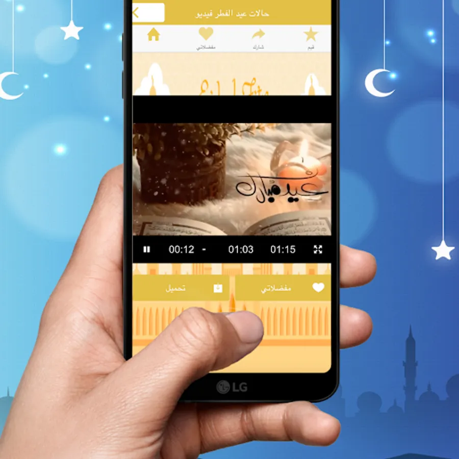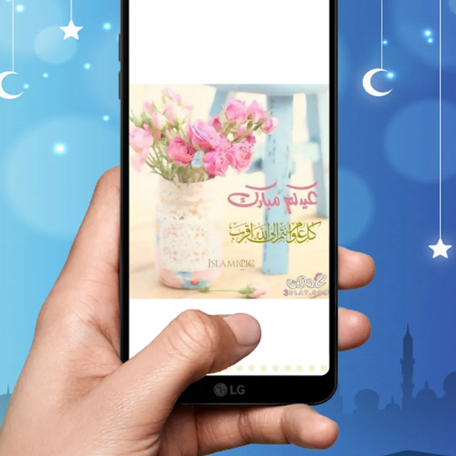 The application contains a collection of short clips of Eid images, greeting cards, backgrounds and Eid al-Fitr designs, where you can greet your friends through them on social networking sites and save them on your mobile phone.