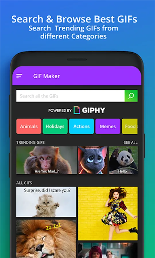 GIF maker is a fun GIF app that will give a huge variety of funny gif which are best to enjoy free time. A huge list of animated GIF will open and can enjoy all video GIF. As this GIF creator has categorized all gif images, so that user can easily search the specific video GIF or GIF images.