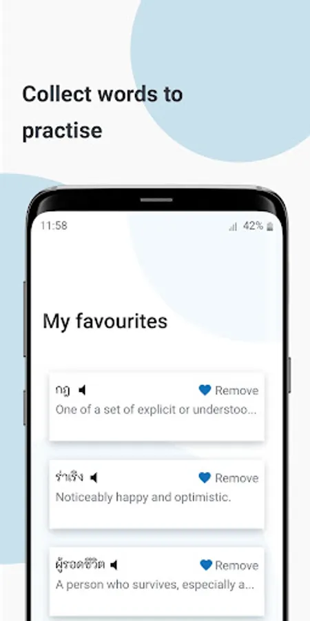 Use the English to Thai switch to read the word, definitions and synonyms in the Thai language itself to get a real idea of context. This app lets you establish link between English and Thai words, so you never have to ask anyone about the meaning of any word. You can even add important words in your favourites section and review them later!