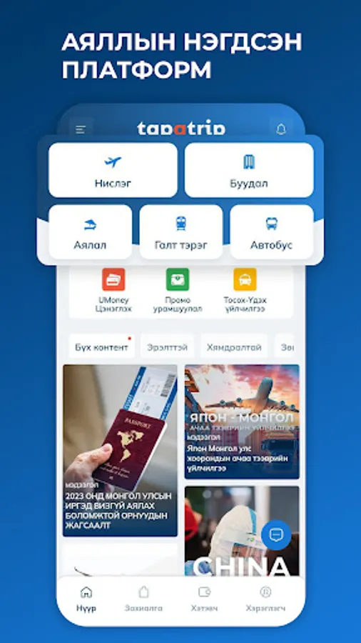 Тапатрип аппликейшн нь аяллын бүх төрлийн үйлчилгээг нэг дороос хэзээ ч, хаанаас ч гар утаснаасаа захиалах боломжийг хэрэглэгч бүрд олгож байна.