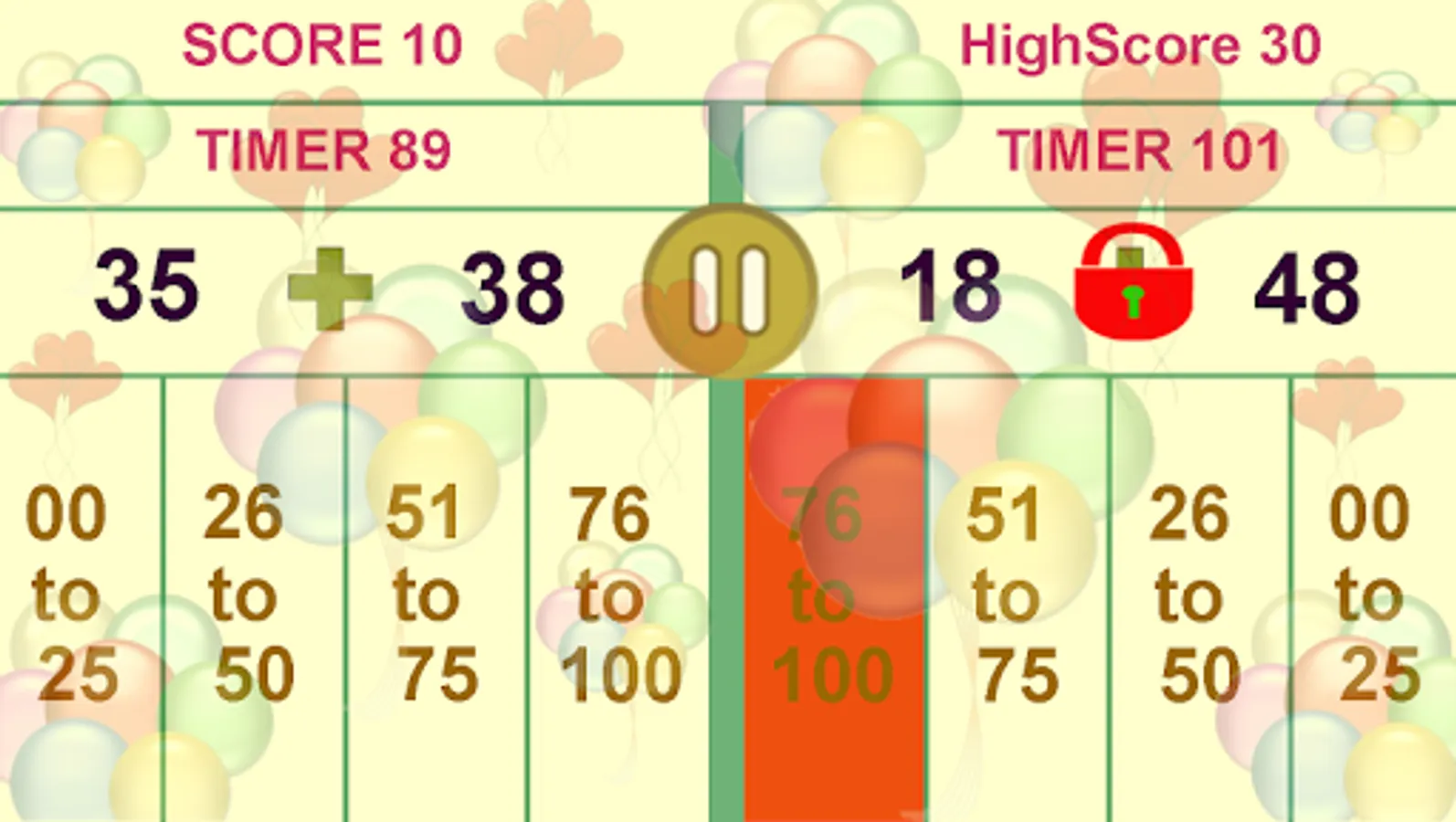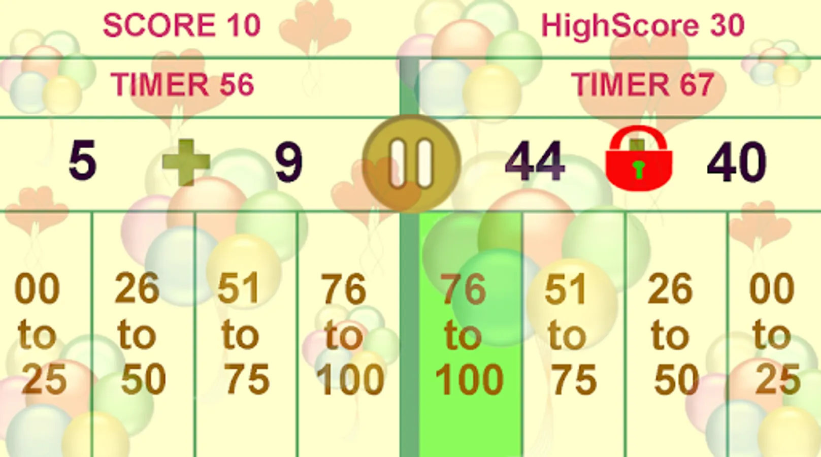 Every specified time interval, new numbers will generate randomly you should calculate and find the respective value range and tap on it (on both columns). If you have good timer value or score value you are the winner. If you tap correctly Green light blinks and else Red light blinks.