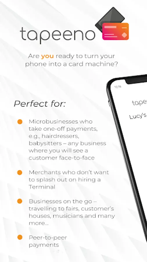 With tapeeno you can use any compatible Android phone to accept contactless card payments. Designed with consumers and small businesses in mind, tapeeno can act as an effective alternative to taking cash or transferring money between friends.