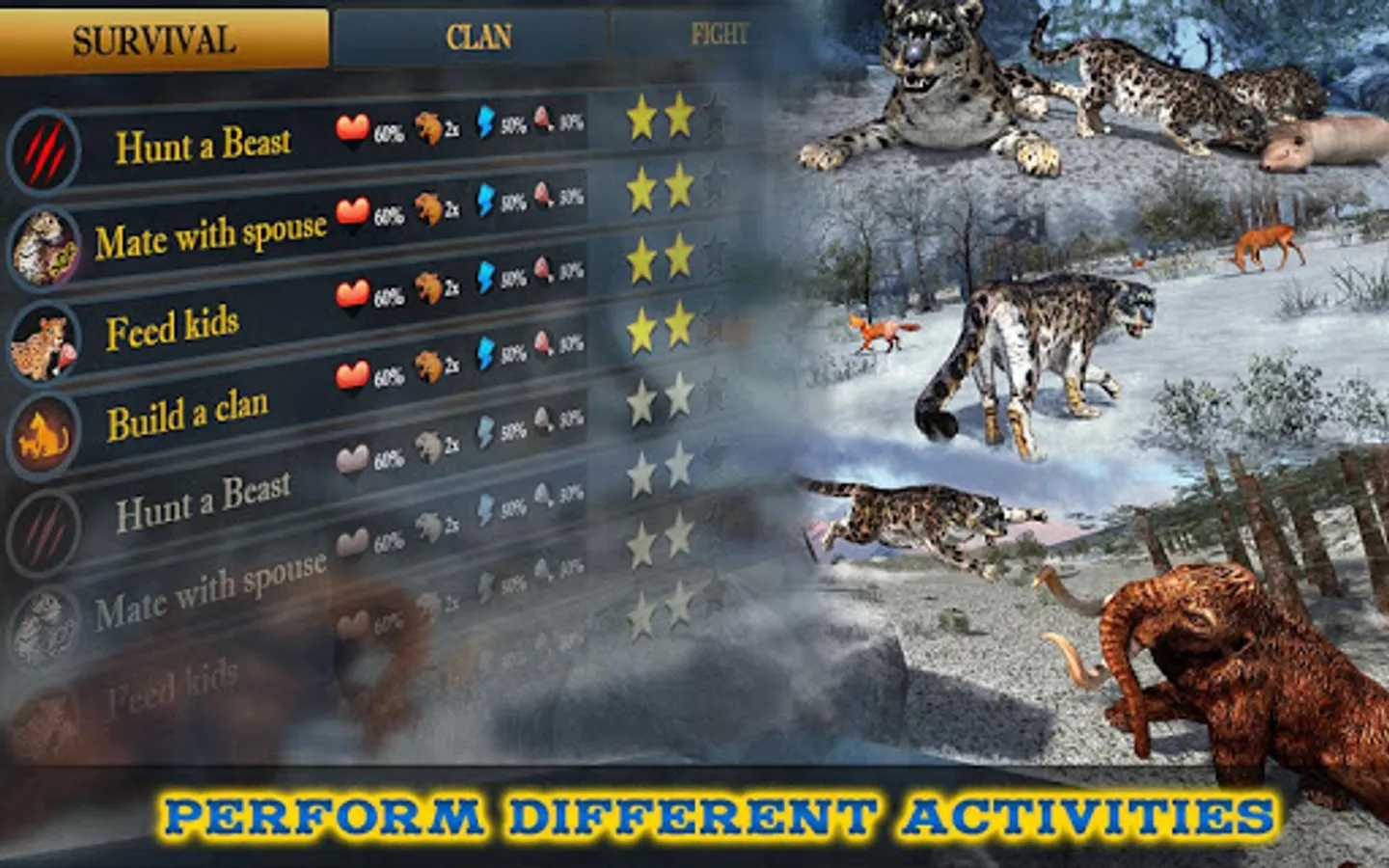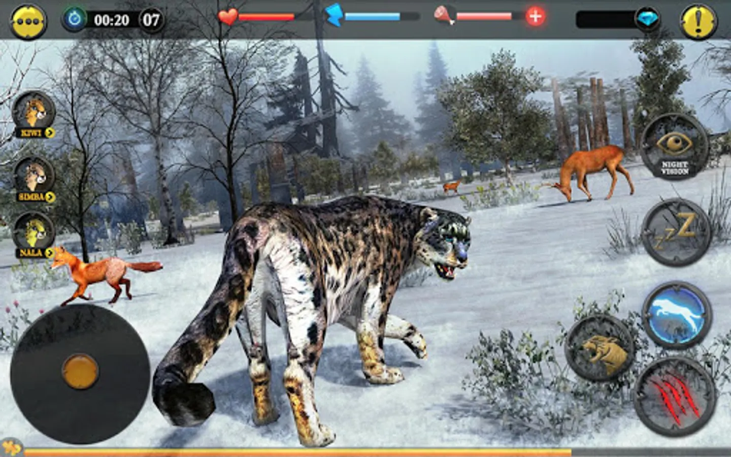 •REALISTIC LIFE SIMULATION: Realistic simulation of snow leopard life. Start as a single leopard and build your pack over time. Hunt, eat, drink & sleep to maintain your health and energy. Complete action packed quests. Upgrade Attack, Energy and health features for better hunting skills. Mate and birth cubs to start a family. Feed and protect these cubs until they grow up and become powerful leaders in the pack.