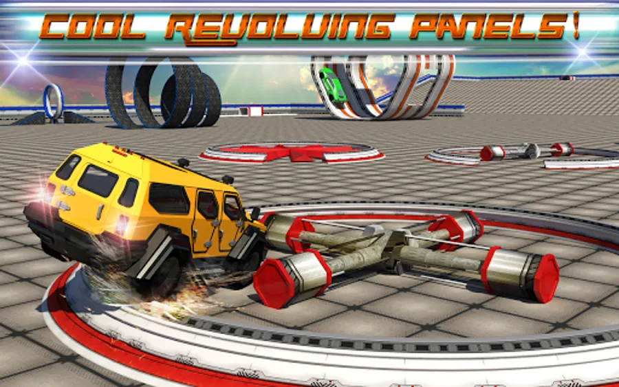 The wild and crazy fantasy stunts city will blow your mind! Modern stunt environment, awesome car smashing machines and mechanized techno based obstacles. Perform high jumps on colossal ramps; accelerate through fiery hoops; jimmy through deadly propellers; knock down and smash all types of obstacles. Dash and race through the stunt city at lightning fast speed displaying cool tricks!
