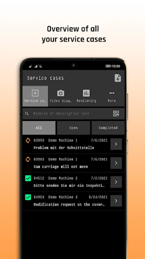 • Keep track of all service cases in your production. Filter by service tickets that have already been solved or the ones in progress.