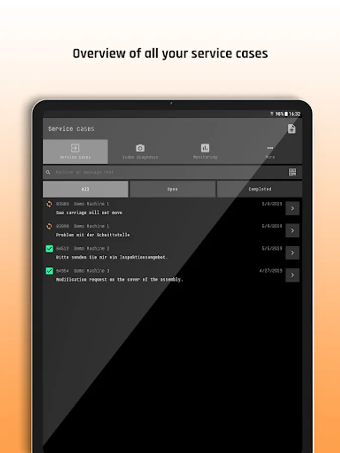 With ServiceBoard you can easily overview your service cases of your machine and the remote maintenance of the machine service. By the help of this app, you solve machine issues faster and have all your service cases on hand - either on your smartphone or tablet.