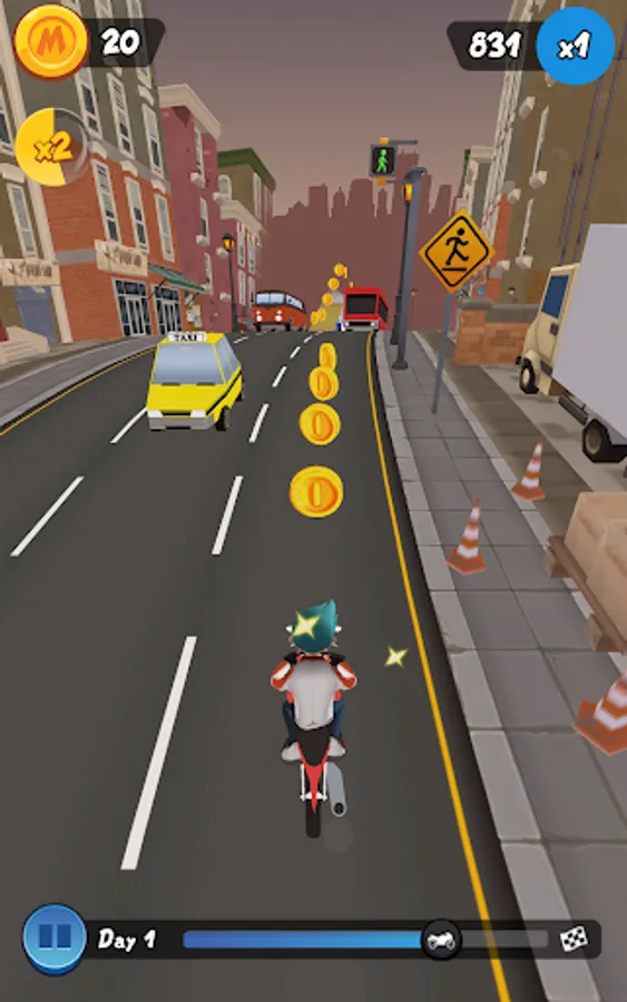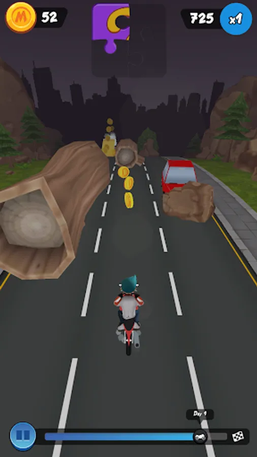 Swipe your finger left, right, up or down to avoid the obstacles in this endless driving motorbike game. Collect coins and use them to buy powerful upgrades and power-ups to help complete each mission and earn a high score.