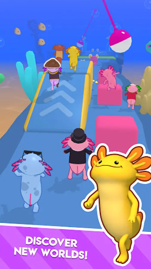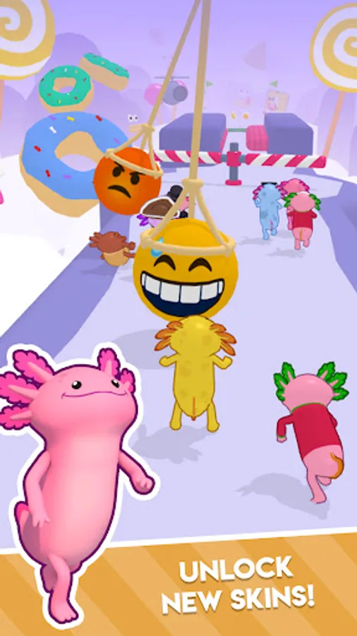 Explore new worlds and go on a running adventure, dodge emojis, dash through balls, jump over rotating fans as you race with other adorable axolotl guys. Collect bonus letters and play the bonus level to gain more free coins and be the best.
