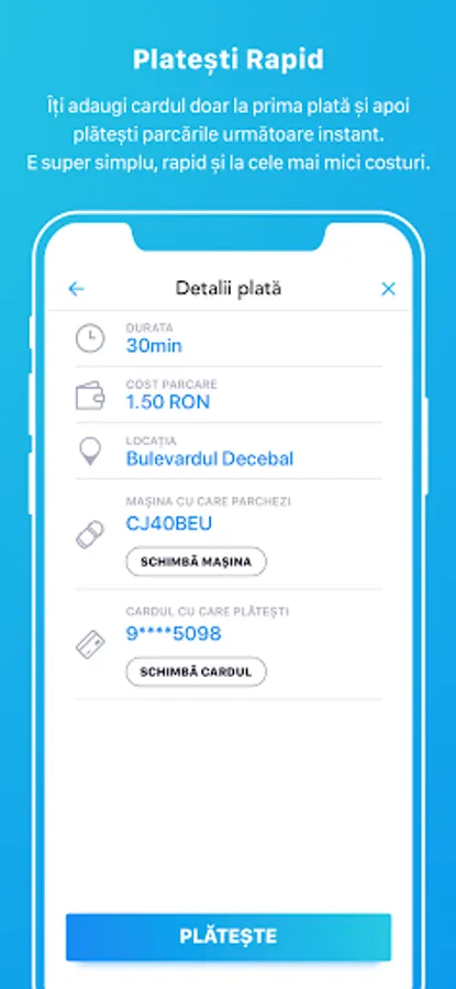 Add your card only for the first payment, and then instantly pay for subsequent parking. You can purchase credits directly from the app or through SelfPay payment stations, to use them for parking payment. The value of one credit is 1 RON. It's super easy and fast.