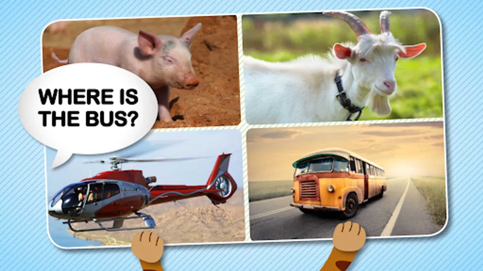 In Guess the Item, 4 different images are shown and a voice will ask the child to locate a certain item, for example "Where is the airplane?". If the child taps the correct item, it gets animated and its special sound is played.
