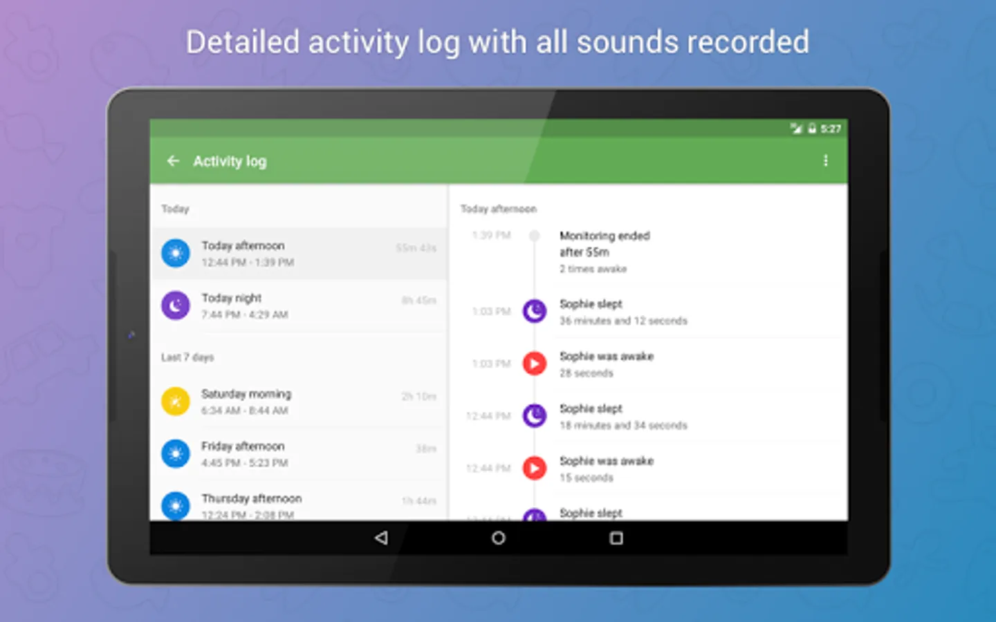 Baby Monitor 3G allows you to check, how often was your baby awake, discover its sleeping patterns and replay sounds from current or any previous monitoring.