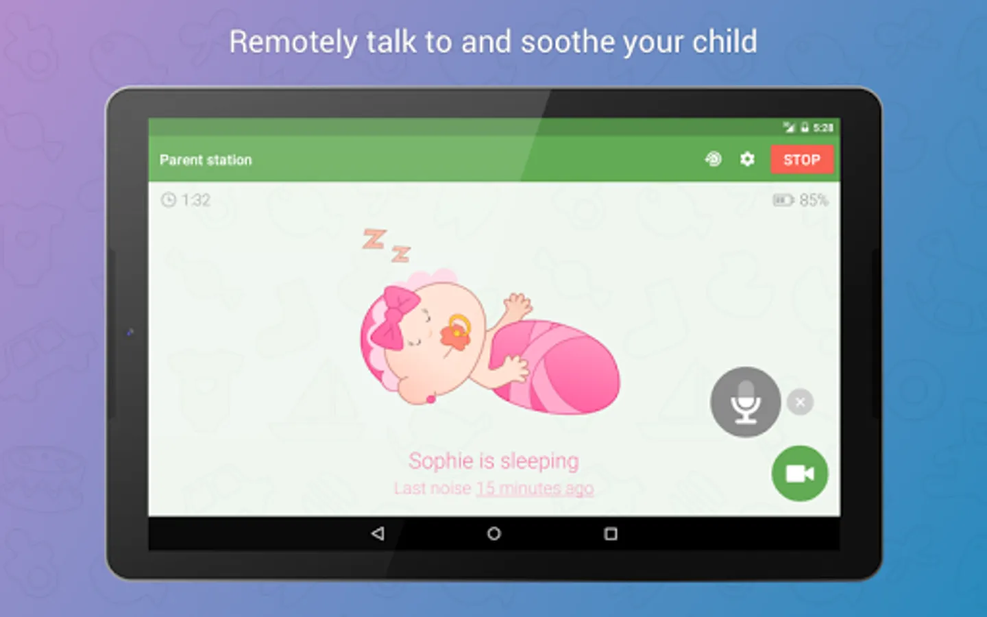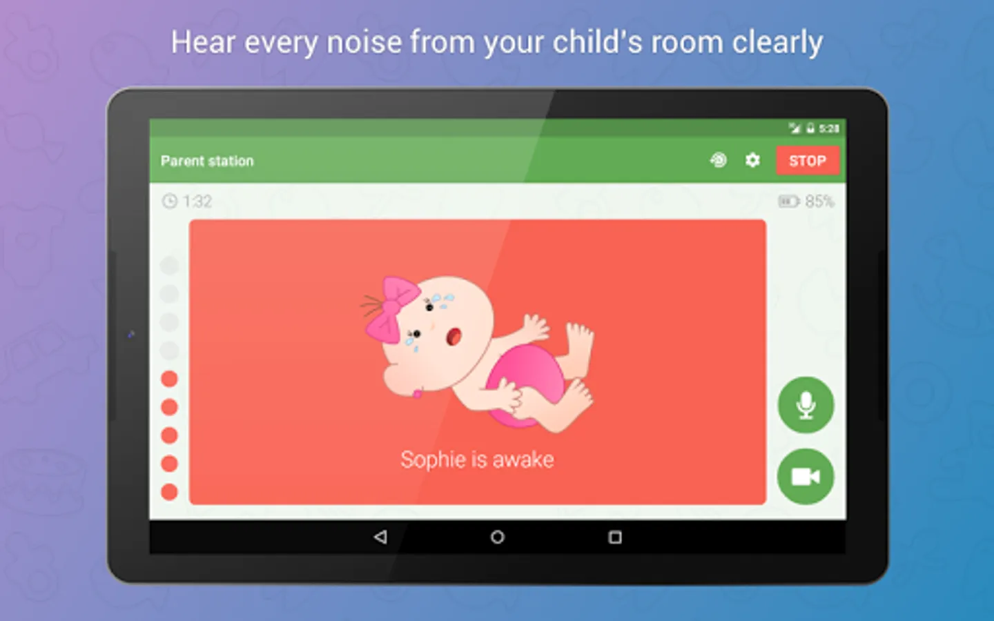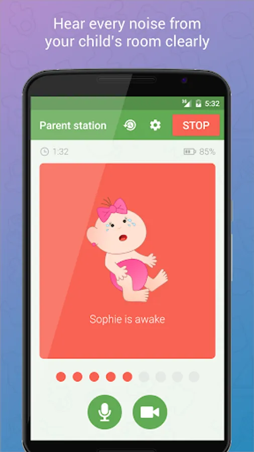 Baby Monitor 3G alerts you in case something goes wrong (network connection problem, etc.).