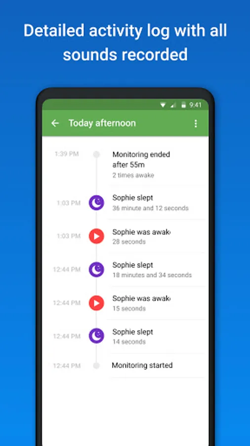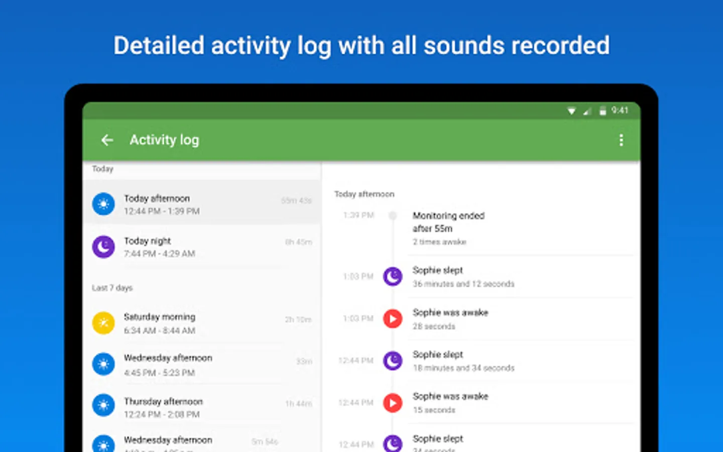 Baby Monitor 3G allows you to check, how often was your baby awake, discover its sleeping patterns and replay sounds from current or any previous monitoring.