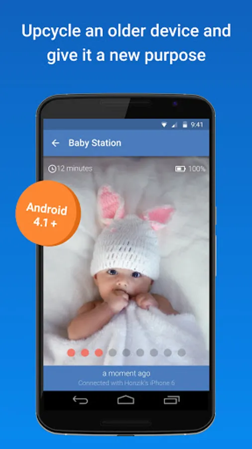 The app requires two devices. One stays in the child’s room while the other one stays with you. No registration or connection adjustments are required and the initial setup takes less than 30 seconds.