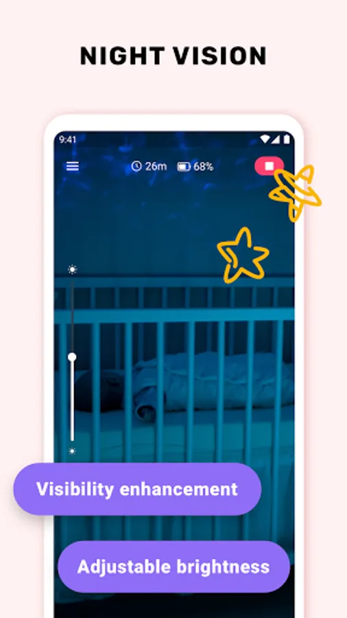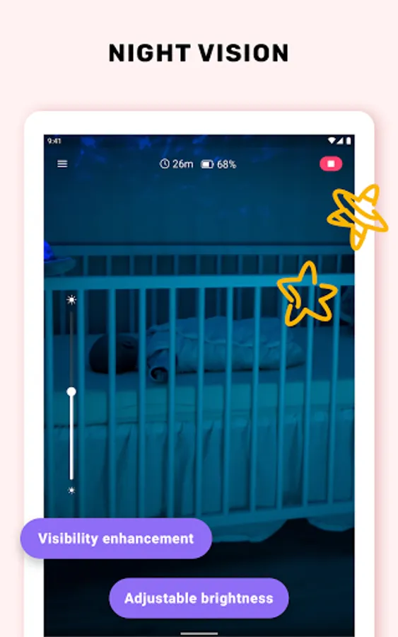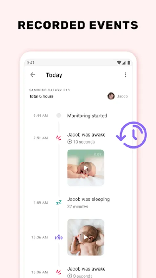 Bibino app records noises, videos, or photos from each monitoring. You can also replay recorded sounds from the monitoring and share the Activity log with another family member or a doctor to discuss your baby’s sleeping patterns and activity.