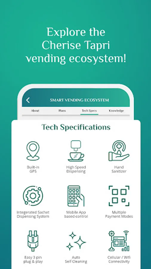 These vending machines are currently one of India’s most advanced, hygienic, fully contactless beverage stations which dispense a wide variety of Cherise beverages on demand, in seconds. The technology, the designs, the IoT dashboard, the assembling, the deployment as well as the maintenance is fully owned and managed by Cherise. Multiple patents for their products and the technology have been filed, and the technology used by Cherise smart vending machines is miles ahead of anything else that is currently available in the Indian market.