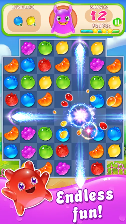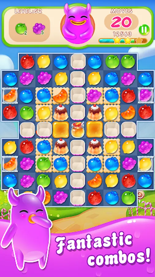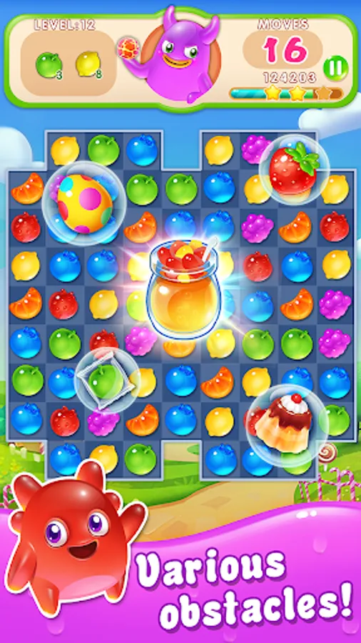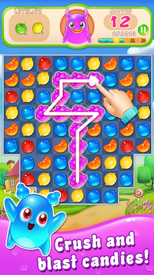 Play candy swap and switch fruit candy to make a match! A group of cute Jelly Monsters live in a fruit candy world. Join Blue Fruit, Red candy, Green gummy and Purple Jelly to solve fruity puzzles! Unlimited life!