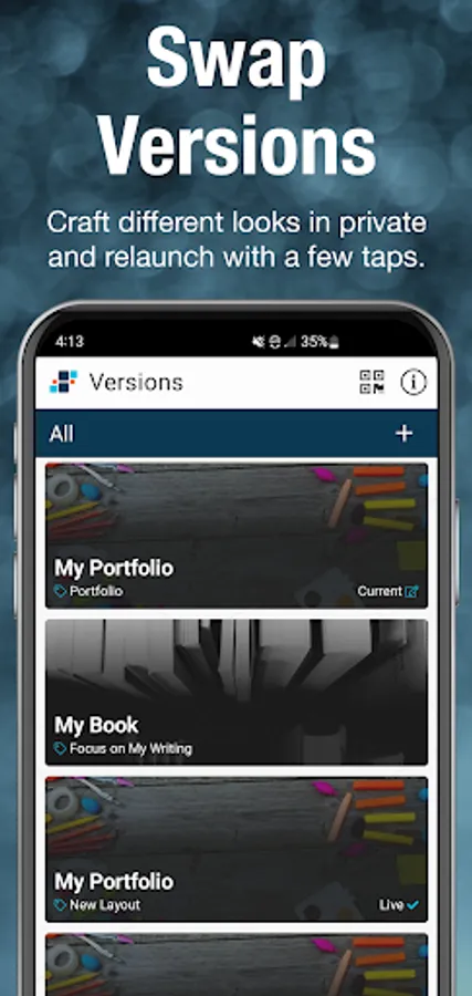 - Create different versions of your website for different needs, and swap what the world sees with a few taps.
