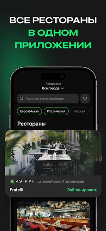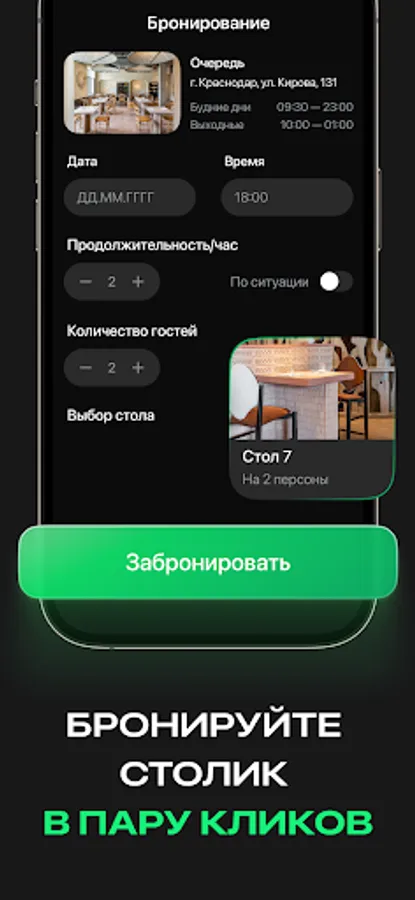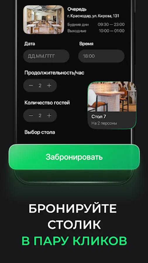 Get acquainted in the application with the best places to relax in your city, evaluate the interior, select a hall and a table from the photo.
