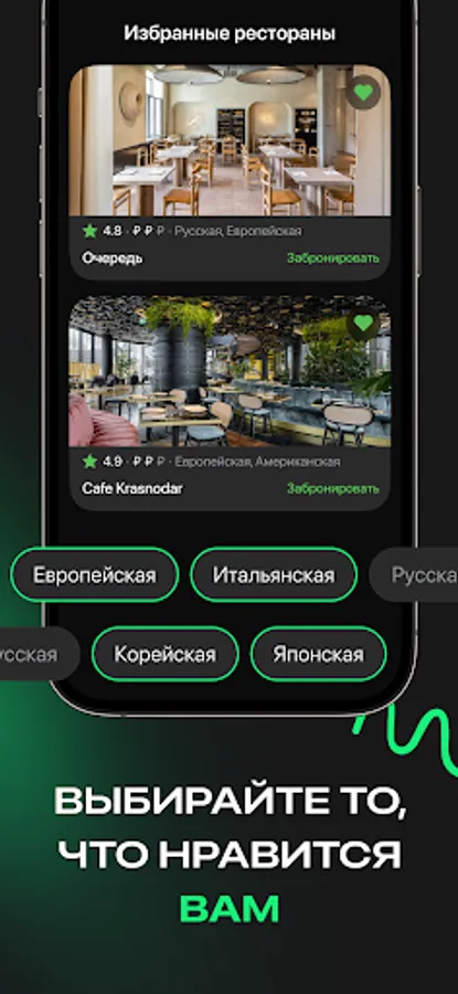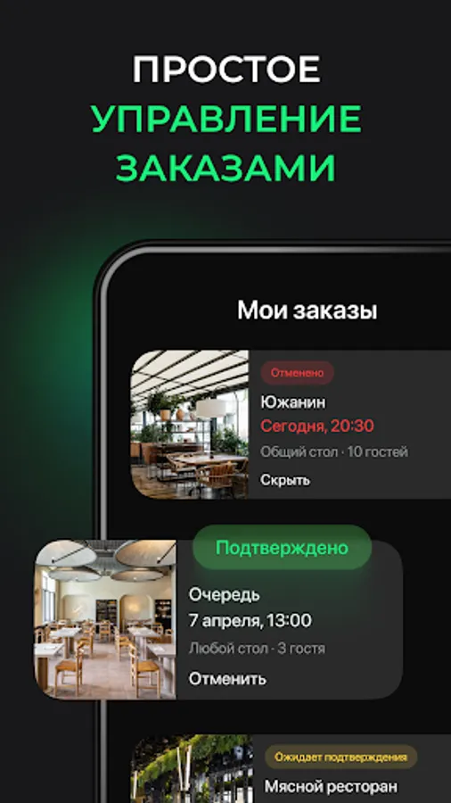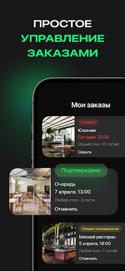 Choose a table in your favorite restaurant, in a cafe nearby on the map, by the rating of other users or by the type of cuisine - and book it online in a maximum of three clicks.